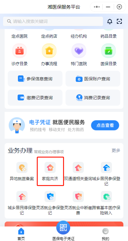 第一步:下載“湘醫(yī)?!盇pp,或進(jìn)入“湘醫(yī)保”App小程序,登錄后在首頁“業(yè)務(wù)辦理”中找到“家庭共濟(jì)”,點(diǎn)擊“共濟(jì)申請(qǐng)”。