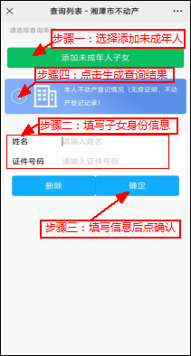 ⑸. 如需添加未成年人請(qǐng)點(diǎn)擊“添加未成年子女”后輸入身份信息并點(diǎn)擊確認(rèn),再點(diǎn)擊“本人不動(dòng)產(chǎn)登記情況”